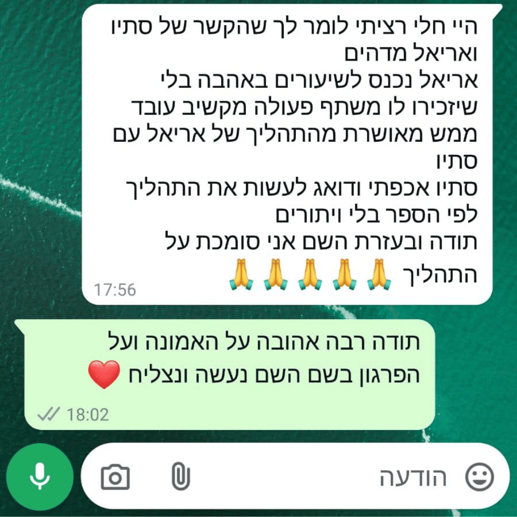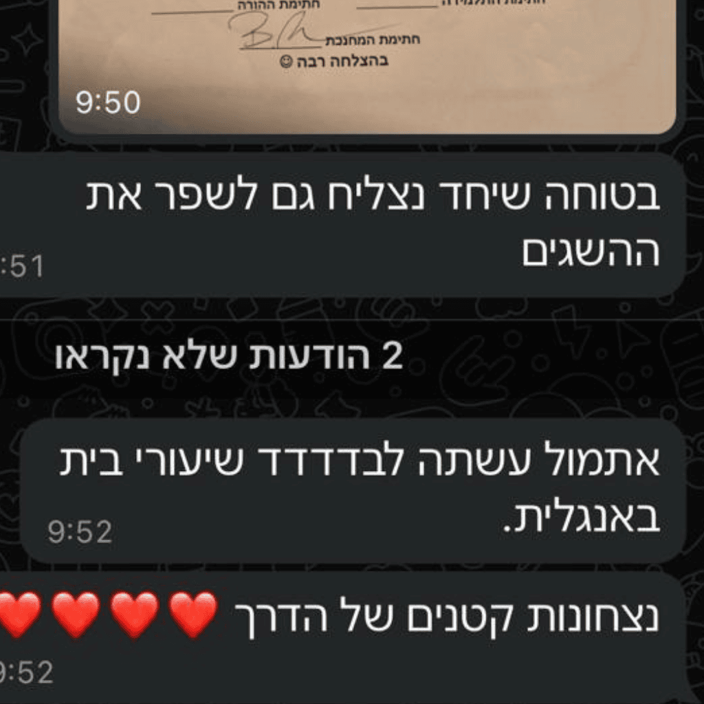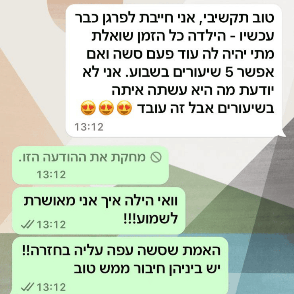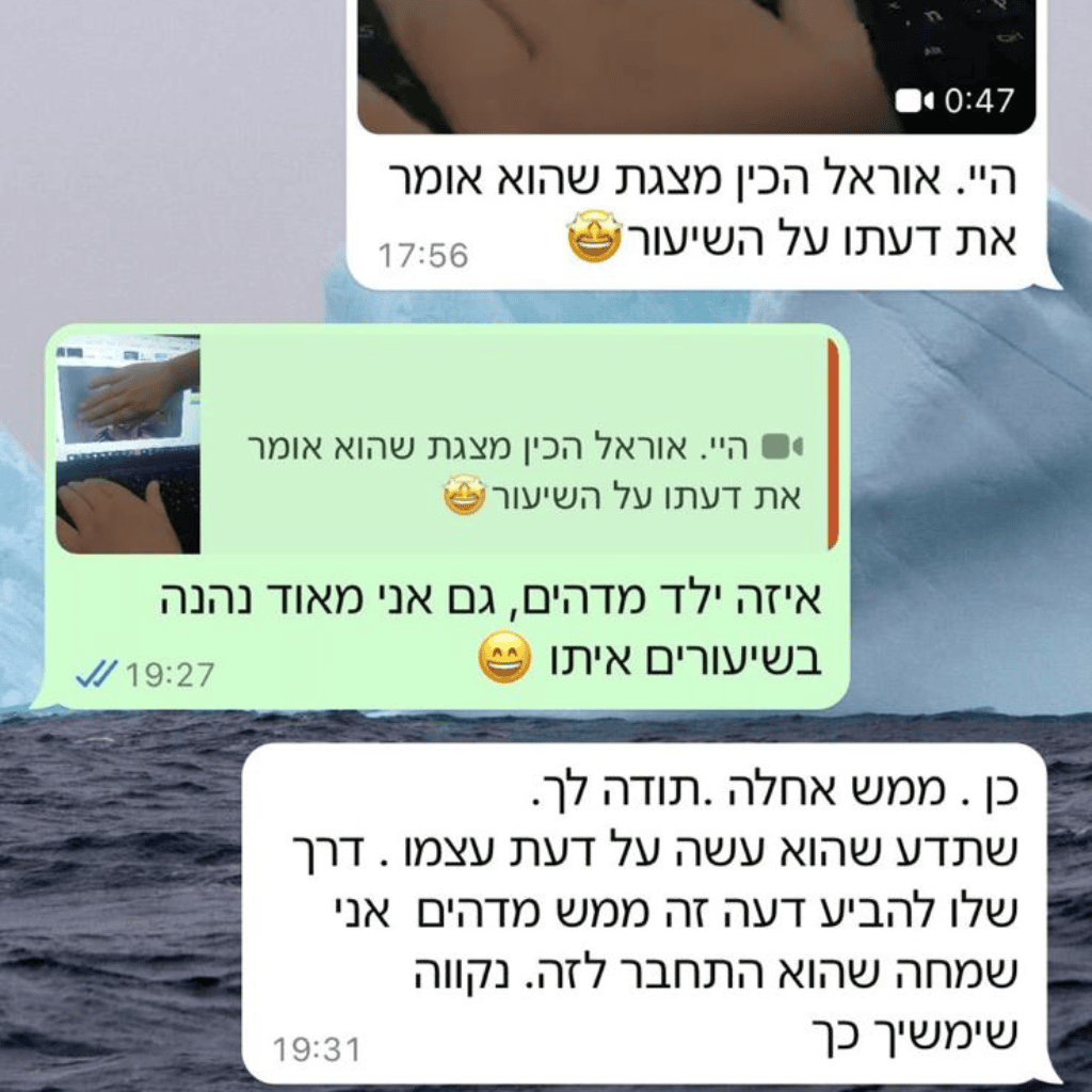 כשאת מבינה איך לדבר בשפה שלו, איך לעורר לו מוטיבציה פנימית, ואיך לבנות לו ביטחון עצמי – החלק של הלימודים נהפך לקל ופשוט. הוא מתחיל לעשות דברים מרצונו. הוא לומד להאמין בעצמו. והכי חשוב – הוא לא תלוי יותר באף אחד חוץ מעצמו.